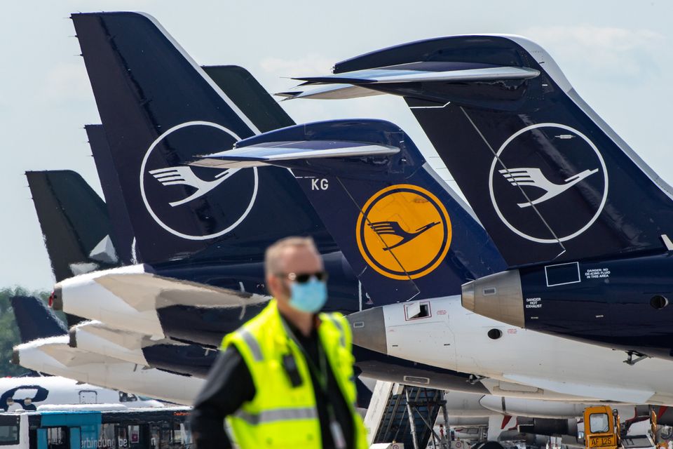 Mann mit Mundschutz vor Lufthansa-Maschinen (Foto aus dem Juni 2020)