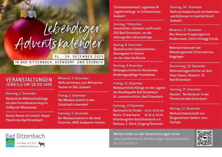 Beim „Lebendigen Adventskalender“ steht die gemeinsame Vorfreude auf Weihnachten im Mittelpunkt. Hinter jedem symbolischen Türchen verbirgt sich ein stimmungsvolles Adventserlebnis. An wechselnden Treffpunkten in Bad Ditzenbach, Auendorf und Gosbach erwartet die Besucher jeweils um 18 Uhr eine kleine Aktion oder Begegnung, die dazu einlädt, die Adventszeit miteinander zu genießen. Ob festliche Dekorationen, das Vorlesen einer ...