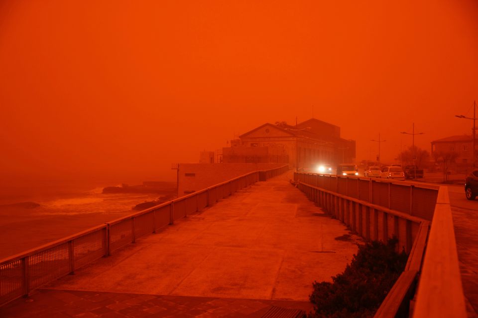 Starke Südwinde haben massenhaft Sand aus der Sahara Richtung griechische Inseln getragen. Es gilt eine Unwetterwarnung – auch in anderen Teilen des Landes.