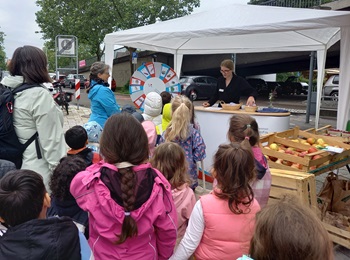 Fotos (Bildquelle: Stadt Eislingen): oben: Die Klasse 10a des Erich Kästner Gymnasiums hat auf dem Wochenmarkt ein leckeres Fairtrade-Frühstück ausgegeben; unten: Die Kindergartenkinder freuten sich sehr über die gewonnenen Marktprodukte beim Glücksrad und lernten dabei regionale Produkte kennen