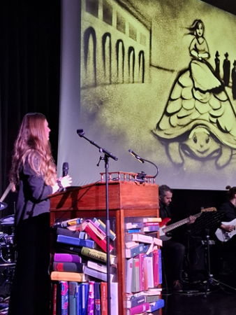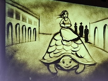 Es wurde aus internationalen Bestzellern vorgelesen,dann kam ein inhaltlich passender Song dazu und zeitgleich brachte eine Sandkünstlerin ein passendes Bild auf eine Großleinwand. Alles fein und zeitlich perfekt abgestimmt.