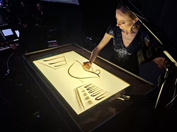 Für die Sandmalerei war die international renommierte Künstlerin Olga Lysytska (Foto links) aus der Ukraine engagiert. Sonst zuhause am Staatstheater Leipzig oder bei großen Firmenevents,wie z. B. bei Türkisch Airways,wo sie die Geschichte der Fluglinie bei einer Jubiläumsveranstaltung in Sand nachzeichnete. Die 38-jährige Olga Lysytska hat Modedesign studiert und kam über die Modezeichnung zur Sandmalerei in der sie mit feinsten Strichen und Kaschierungen aus einfachem Sand herausragende Bilder schafft,die von einem von untern beleuchtetem gläsernem Pult auf die Großleinwand projiziert wird. Seit 13 Jahren ist sie nun als Sandkünstlerin international unterwegs und hat damit,wie sie sagt,ihren Traumberuf gefunden.