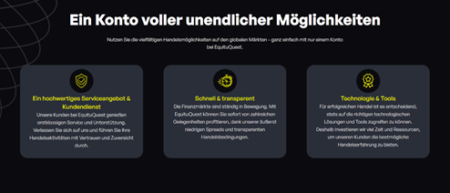 In der EquituQuest Bewertung zeigt sich,dass der Broker sich durch seine schnellen Ausführungen,niedrigen Spreads und die Möglichkeit,sowohl auf Desktop- als auch auf mobilen Geräten zu handeln,von der Konkurrenz abhebt. Mit einer Vielzahl von Kontotypen,die auf die unterschiedlichen Bedürfnisse der Trader zugeschnitten sind,sowie einem exzellenten Kundenservice ist EquituQuest bestens positioniert,um in der wettbewerbsintensiven Welt des Online-Handels erfolgreich zu sein. Egal,ob Sie gerade erst mit dem Handel beginnen oder ein erfahrener Profi sind,EquituQuest bietet die Werkzeuge und Ressourcen,die Sie benötigen,um Ihre Handelsziele zu erreichen.