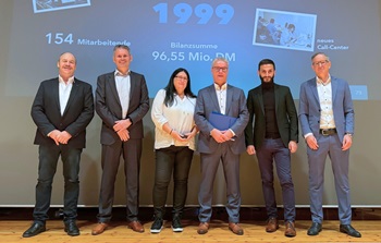 Foto: v. l. n. r.: Betriebsratsvorsitzender Kurt Oelkuch,Vorstandsmitglied Ralf Wuchenauer,Carmen Boger,Oliver Reichart,Vincenzo Renner und Vorstandsmitglied Jens Buchholz.