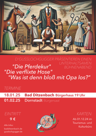 Das Tourismus- und Kulturbüro Bad Ditzenbach lädt herzlich zu einem Theaterabend ein: Am Samstag,den 18. Januar 2025 präsentiert die Tomerdinger Theatergruppe D’Gusslochgugger e.V. im Bürgerhaus Bad Ditzenbach ab 19 Uhr ihre humorvollen Bühnenstücke.