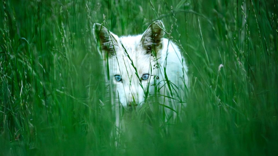 Der weiße Rotfuchs im hohen Gras