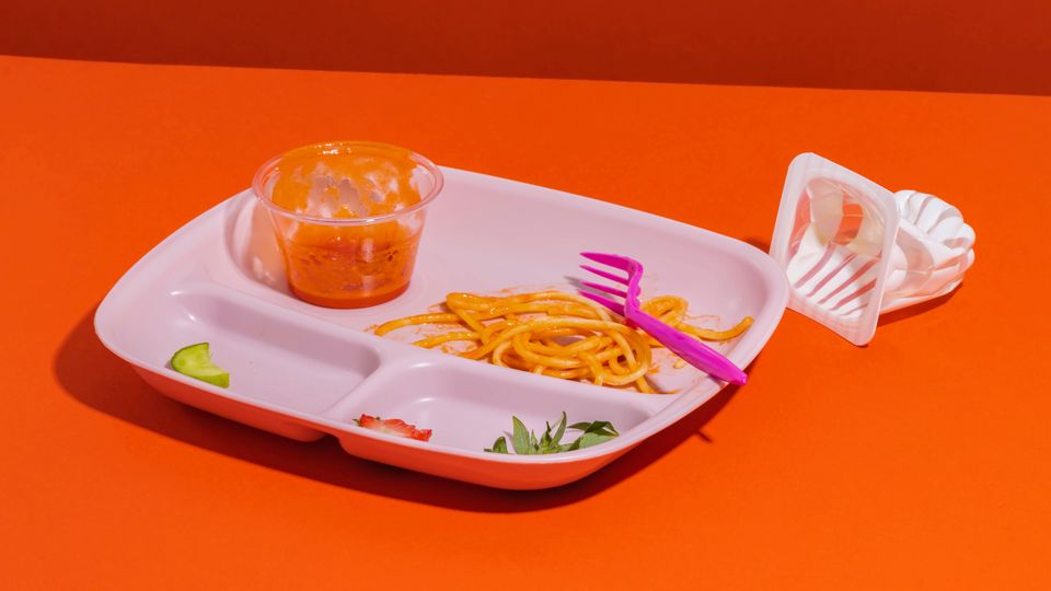 Tablett mit Essen: Übrig gebliebene Speisen gehören in den Mülleimer