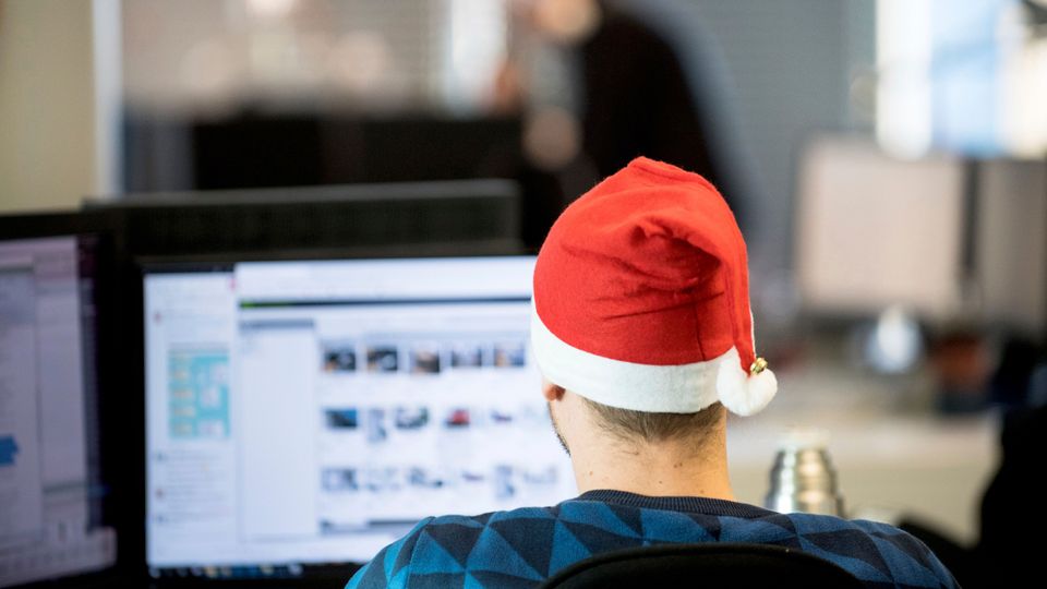 Ein Beschäftigter sitzt mit Weihnachtsmütze am Arbeitsplatz