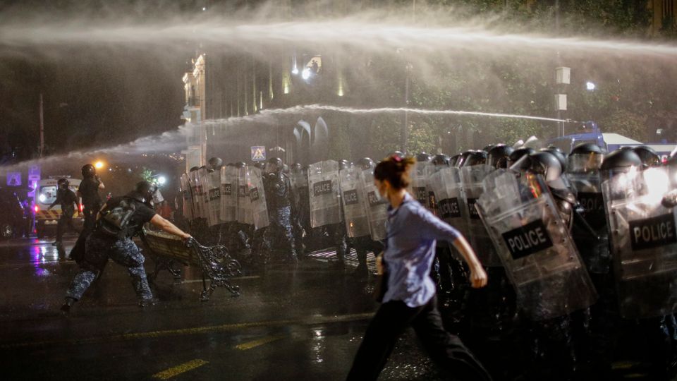 Bei Protesten in Tiflis vergangenes Jahr sollen georgische Sicherheitskräfte laut einer BBC-Recherche Wasserwerfer mit einem chemischen Kampfstoff befüllt haben. Die Regierung weist die Vorwürfe zurück.